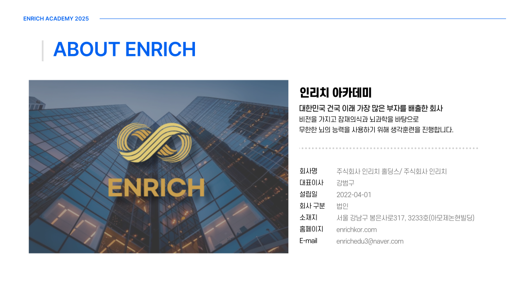 Enrich는 단순한 회사가 아니라 하나의 운동입니다. 우리의 비전은 한국과 그 너머에 파급력을 미칠 번영의 물결을 창조하는 것입니다. 우리는 재정적으로 성공할 뿐만 아니라 사회적으로 책임감을 갖고 세상에 긍정적인 영향을 미치려는 열망을 지닌 개인 세대를 육성하기 위해 최선을 다하고 있습니다.